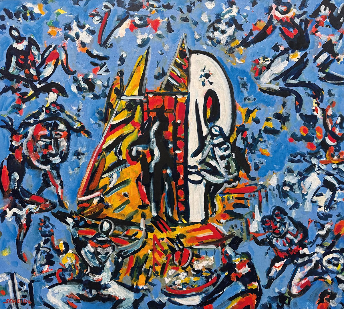With his persistent search for a link between figural, narrative and informal composition, Roman Scheidl occupies a special place in Austrian contemporary art, which has been reflected since the 1970s by regular exhibitions in cities such as Paris, New York, Tokyo and Stockholm, as well as Vienna (1976, 1983 and 2008 in the Albertina). An “Austrian citizen of the world”, influenced by both Far Eastern philosophers and Josef Beuys, Scheidl had studios in Switzerland and Paris, and creates pictures as a means of understanding the world. His chosen themes are mostly poetic and philosophical, of an existential nature, so that they speak deeply and movingly to the archetypal within us.