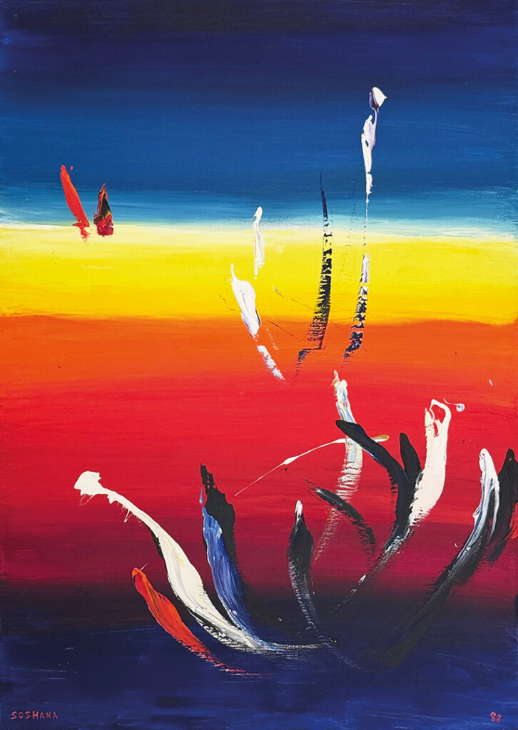 At the end of the 1950s, Soshana was in close contact with Scandinavia’s Cobra group, and studied Japanese calligraphy. In 1952, she visited Marc Chagall in Saint-Paul de Vence, where she first came into contact with Art Informel, a foundational new movement of post-war art that continues to exert an influence today. Inspired by the emotional, spontaneous and gestural techniques used by Art Informel painters, Soshana developed a style in which she contrasted individual, hieroglyphic-like objects with ambiguous image spaces.